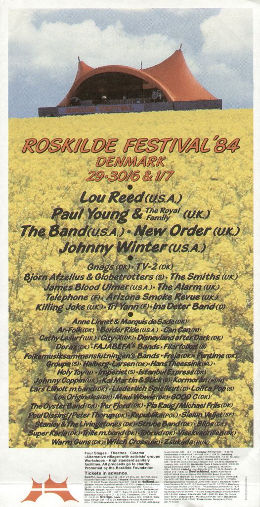 Egentlig burde den mest mindeværdige oplevelse fra 1984 være, da jeg fik lov til at se New Order spille direkte fra kulissen på Canopy Scenen. Det var det bare ikke. Min festivaldebuterende drengekrop blev derimod blæst væk af The Alarm, en walisisk discount-udgave af U2, der lørdag eftermiddag spillede på beatfestivalens store scene. The Alarm havde højt hår, læderveste og militærjakker på – og de spillede storladne, anti-Thatcheristiske rocksange med prætentiøse titler som ’68 Guns’, ‘The Stand’ og ‘Blaze of Glory’. Episk! Den oplevelse betød, at samtlige mine lommepenge de kommende år blev brugt på plader med bandet fra Rhyl i det nordvestlige Wales.
