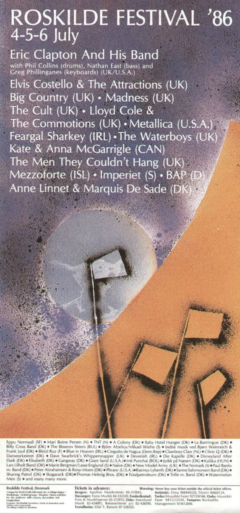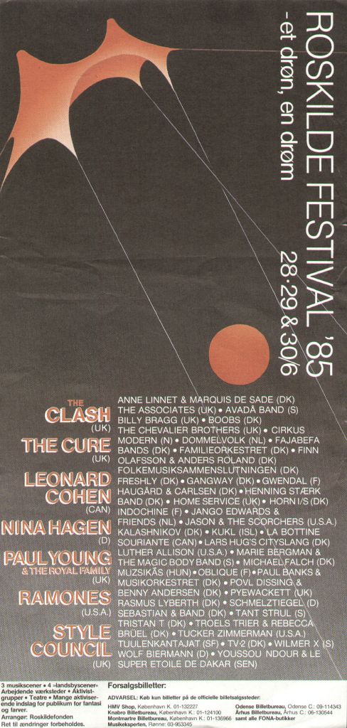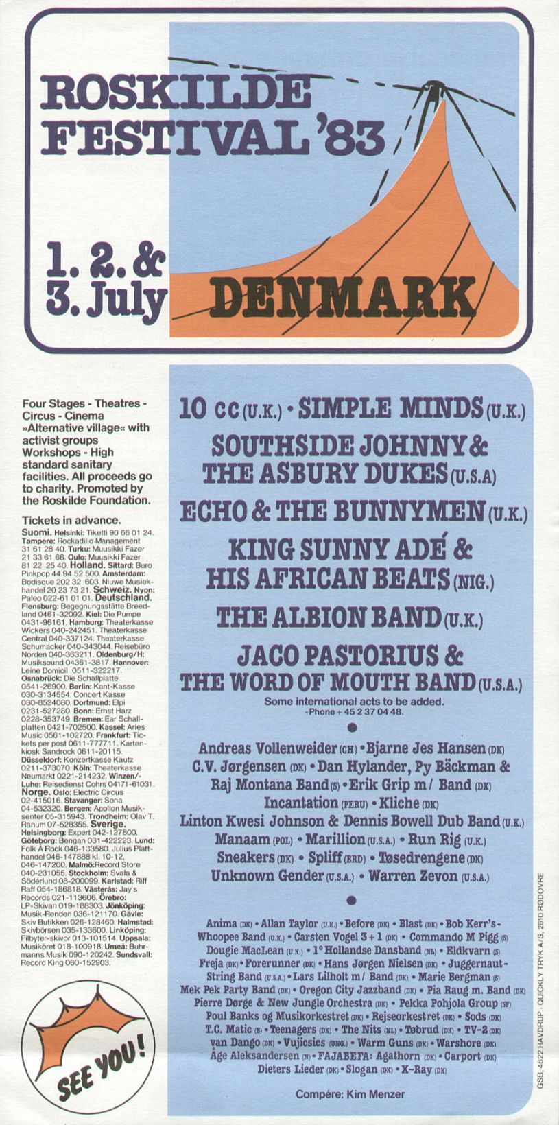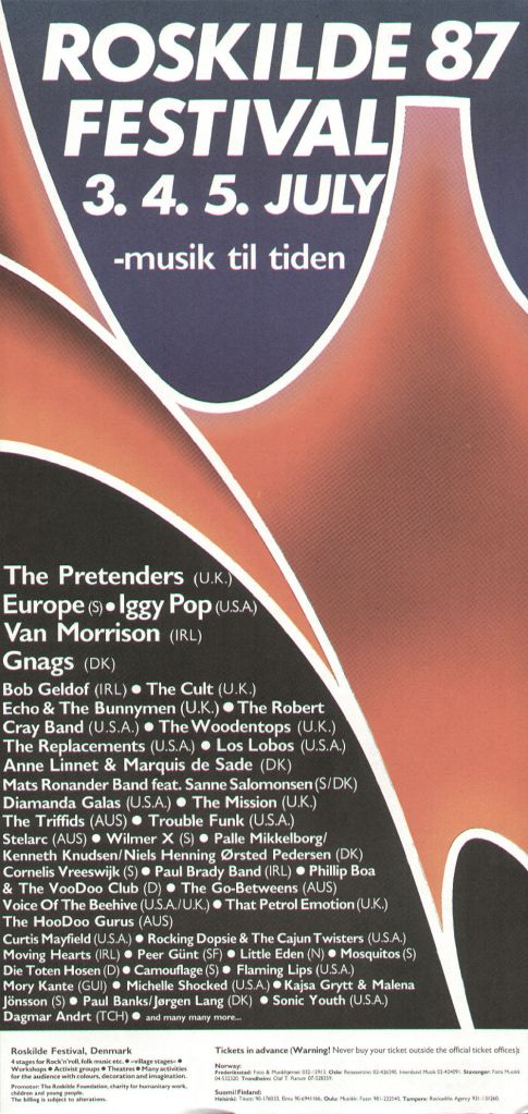 En klassisk debut med masser af dansk rock. Valgte Kliche, Warm Guns og Blast frem for Simple Minds og Echo & The Bunnymen. Var med til at buh’e Warren Zevon af scenen (han forsinkede Sneakers, for pokker). Det hele faldt i hak søndag eftermiddag. Hvis du har glemt det, så spillede Andreas Vollenweider harpe, havde Rudi Völler-hår og blev i årene efter lydsporet til krystalhealing og idrætsmassage. Men han gav komplet mening den eftermiddag på græsset i teltet.