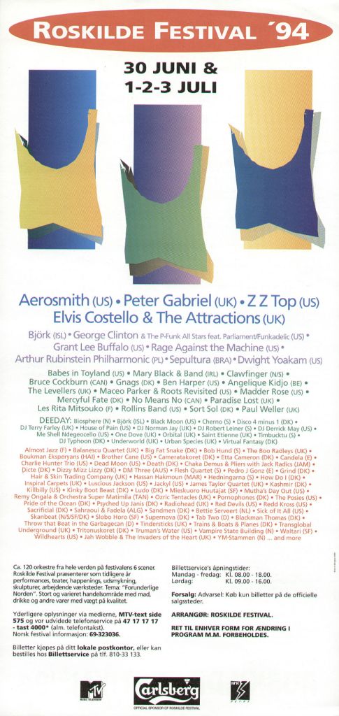 Højdepunktet kunne have været Björk, der legede klubdronning i Deeday-teltet med sit nye ‘Debut’-album i ryggen. Men efter at have været levende dominobrikker i det overfyldte telt hele det første kvarter, syntes min ven Morten og jeg ikke, at det var sjovt længere. I stedet blev højdepunktet at gå teenager-amok til Rage Against The Machine, som peakede i 94 med deres politisk tændte metal-rap.