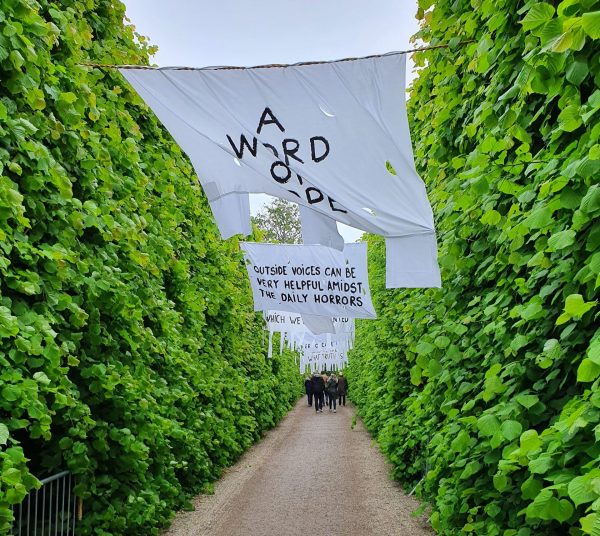 Går ud gennem renæssancehaven, mens ekstranumrene spiller. ‘West End Girls’ og ‘Being Boring’.