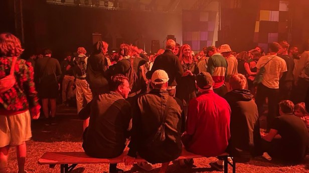 00.54, Smølle: Vi er tilbage på samme scene til Iceage, nu bevæbnet med kold rosé. Stadig et fund i en tid, hvor ølpriserne eksploderer. Og hvad vi ser … er campingstolkulturen taget til næste logiske skridt. Bænk i teltet!